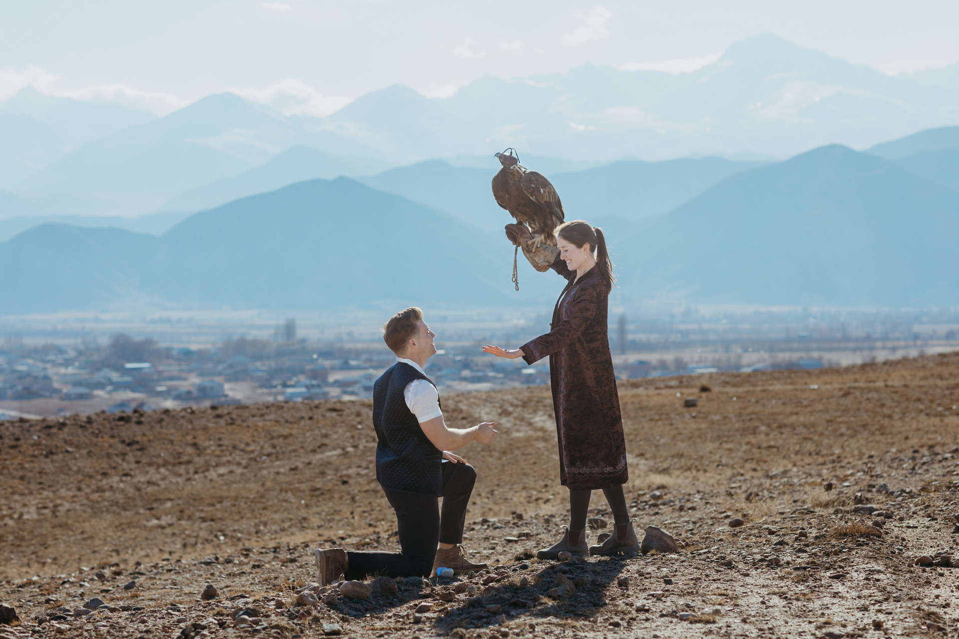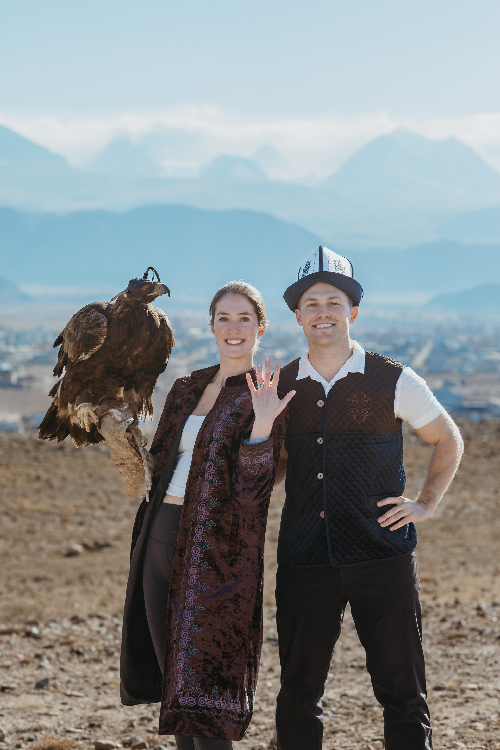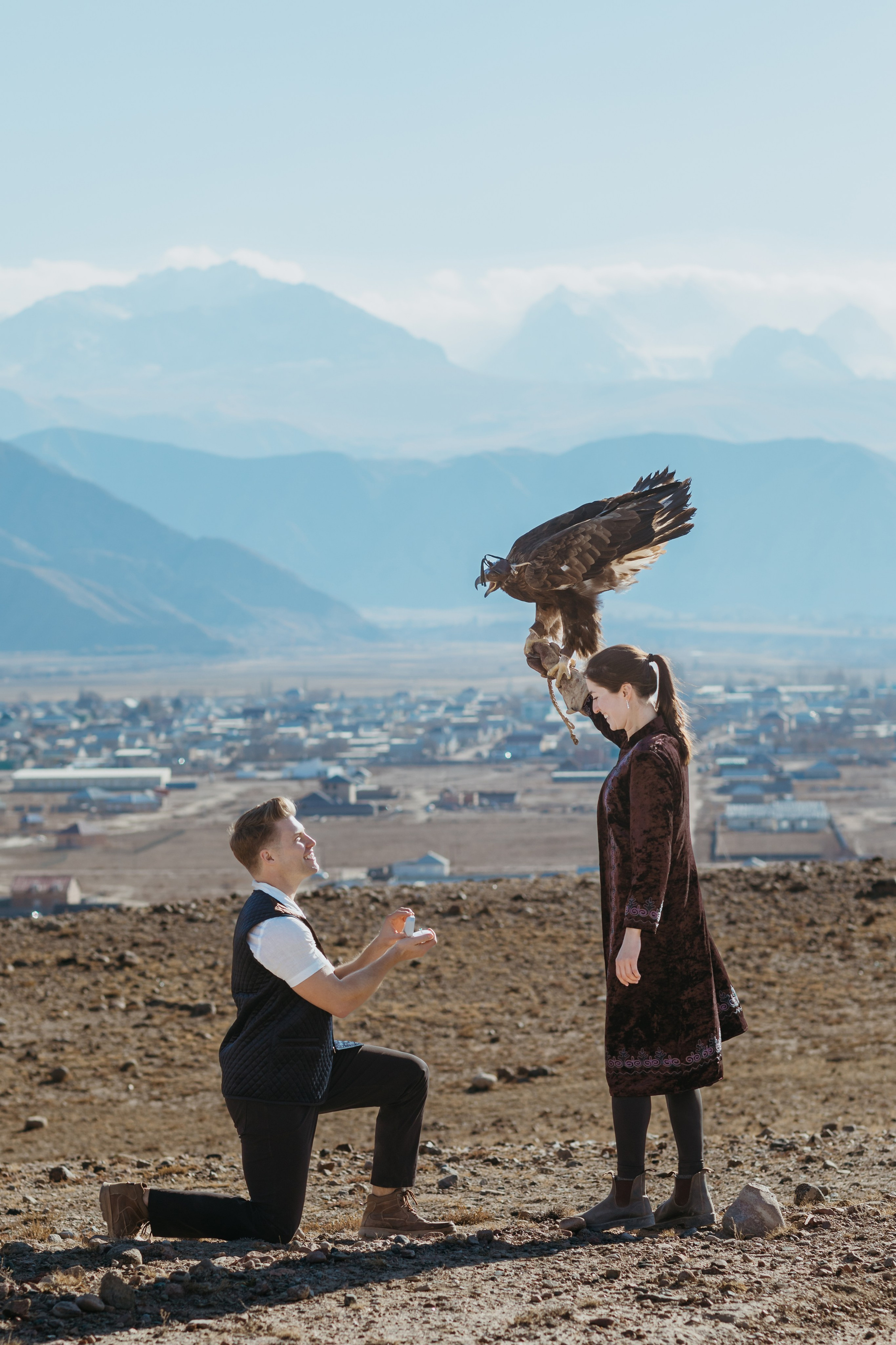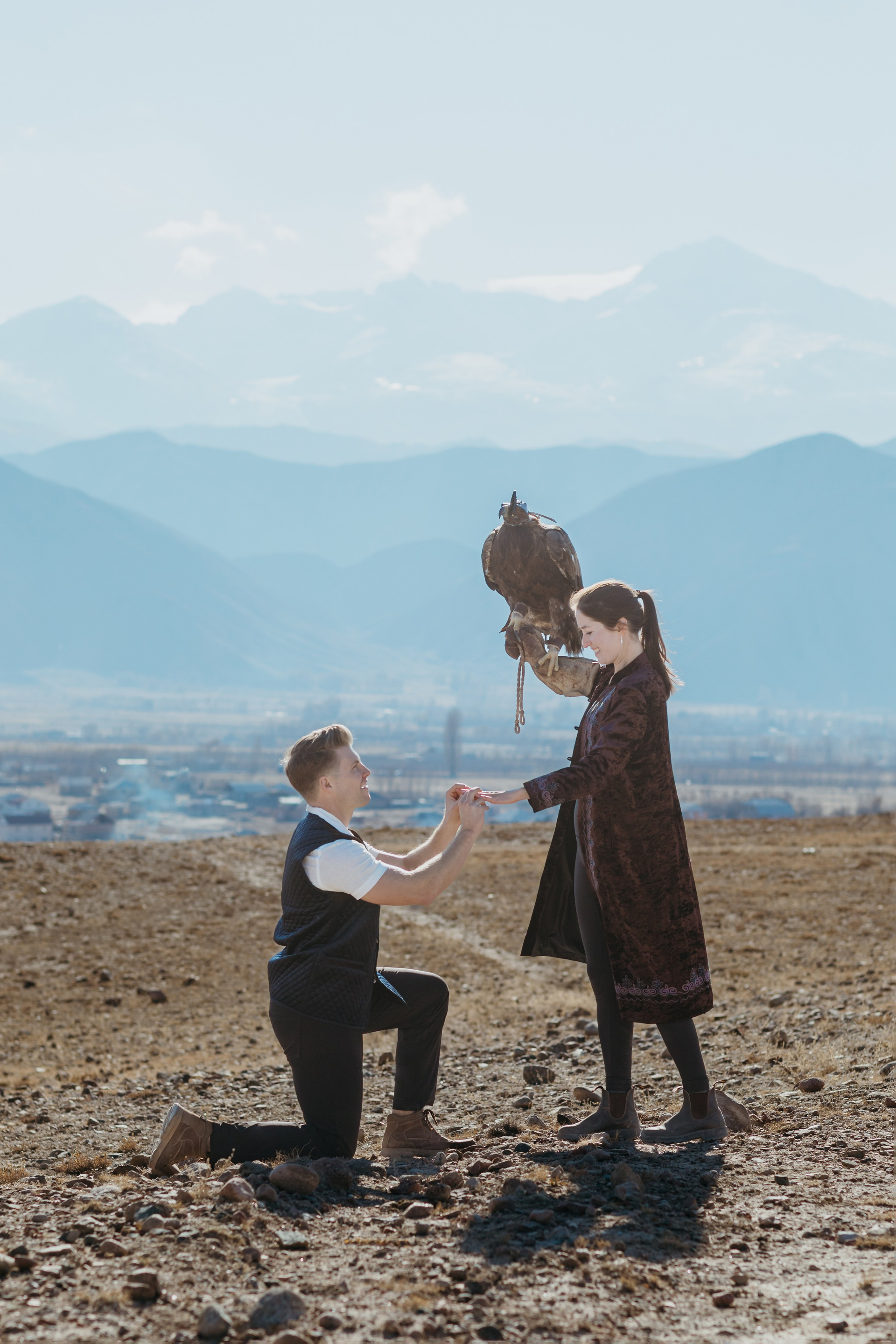 A proposal story of Daniel and Jess (USA) during their trip to Kyrgyzstan. The shoot took place at Issyk-Kul, near Kajy-Say, during eagle hunting. The gallery includes the proposal moment, documentary-style frames from the experience, and a short couple session afterwards.