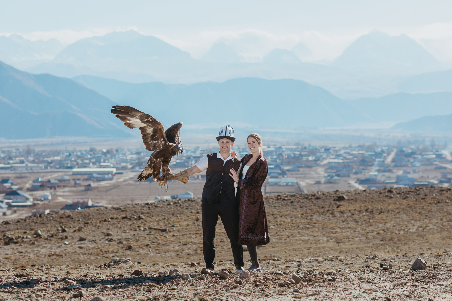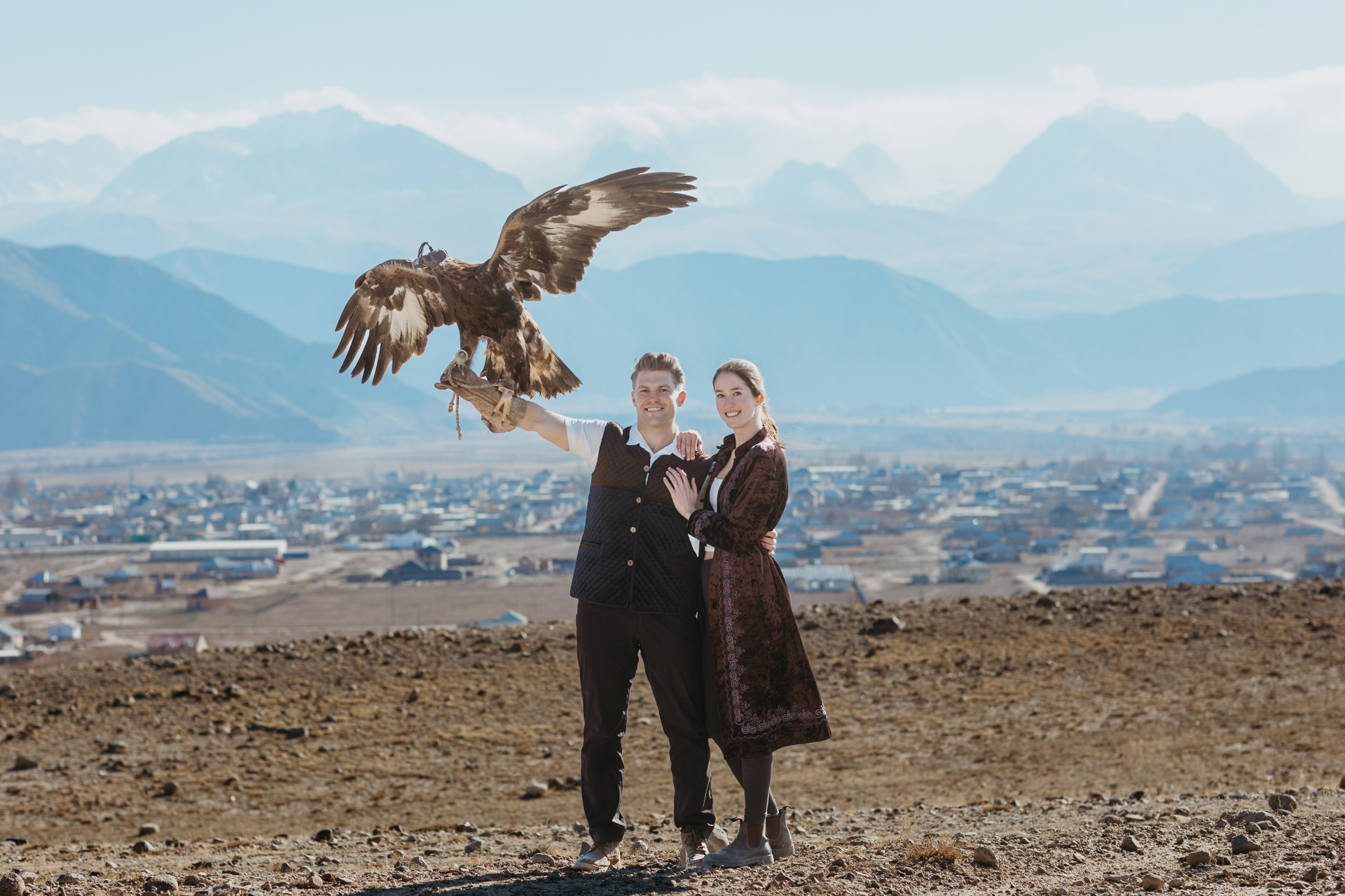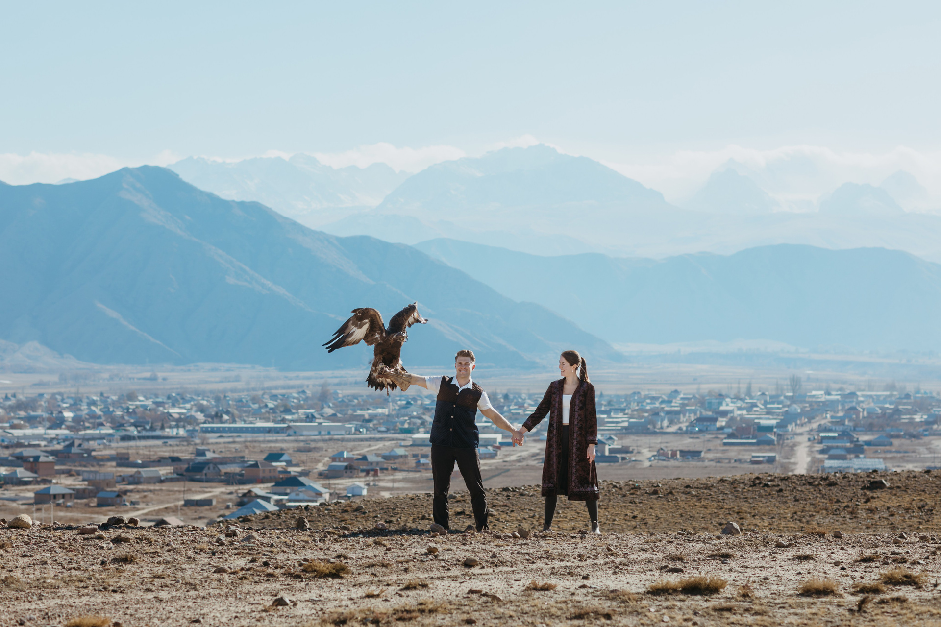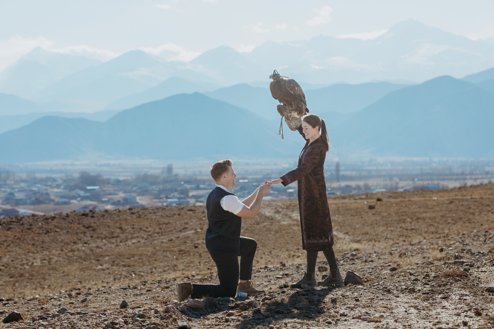 A proposal story of Daniel and Jess (USA) during their trip to Kyrgyzstan. The shoot took place at Issyk-Kul, near Kajy-Say, during eagle hunting. The gallery includes the proposal moment, documentary-style frames from the experience, and a short couple session afterwards.